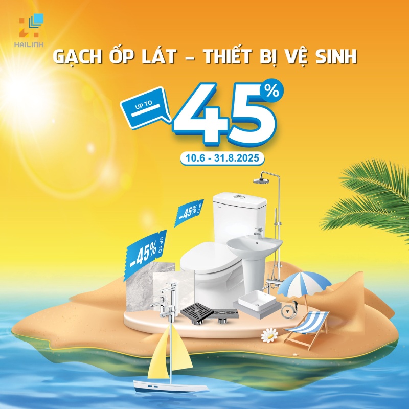 Hè sang rực rỡ, Hải Linh bùng nổ với chương trình khuyến mãi đỉnh cao nhất năm! Từ 10.06 – 31.08.2025, Siêu Sale hết cỡ lên tới 45% toàn bộ sản phẩm gạch ốp lát, thiết bị vệ sinh và phụ kiện chính hãng. Đặc biệt:
